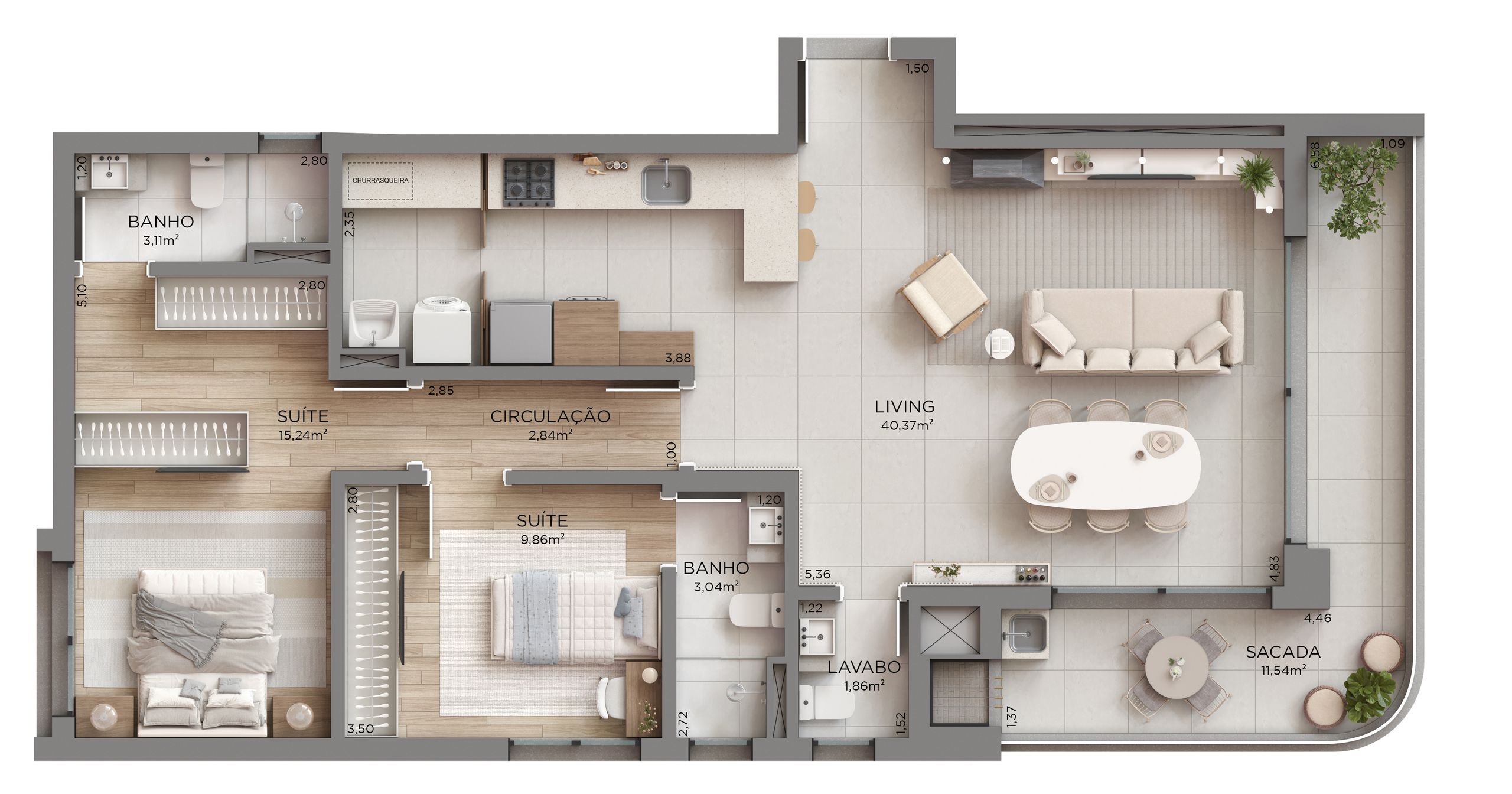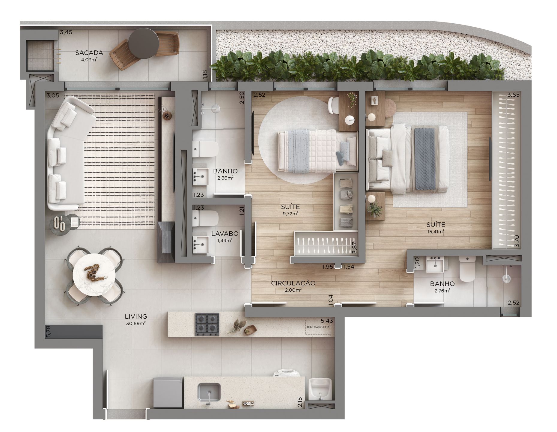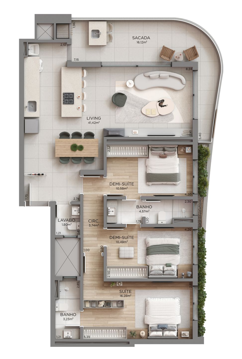 - Integração com o verde Floreiras autoirrigáveis espalham frescor, vida e beleza por todo o projeto, aproximando a natureza do dia a dia.
